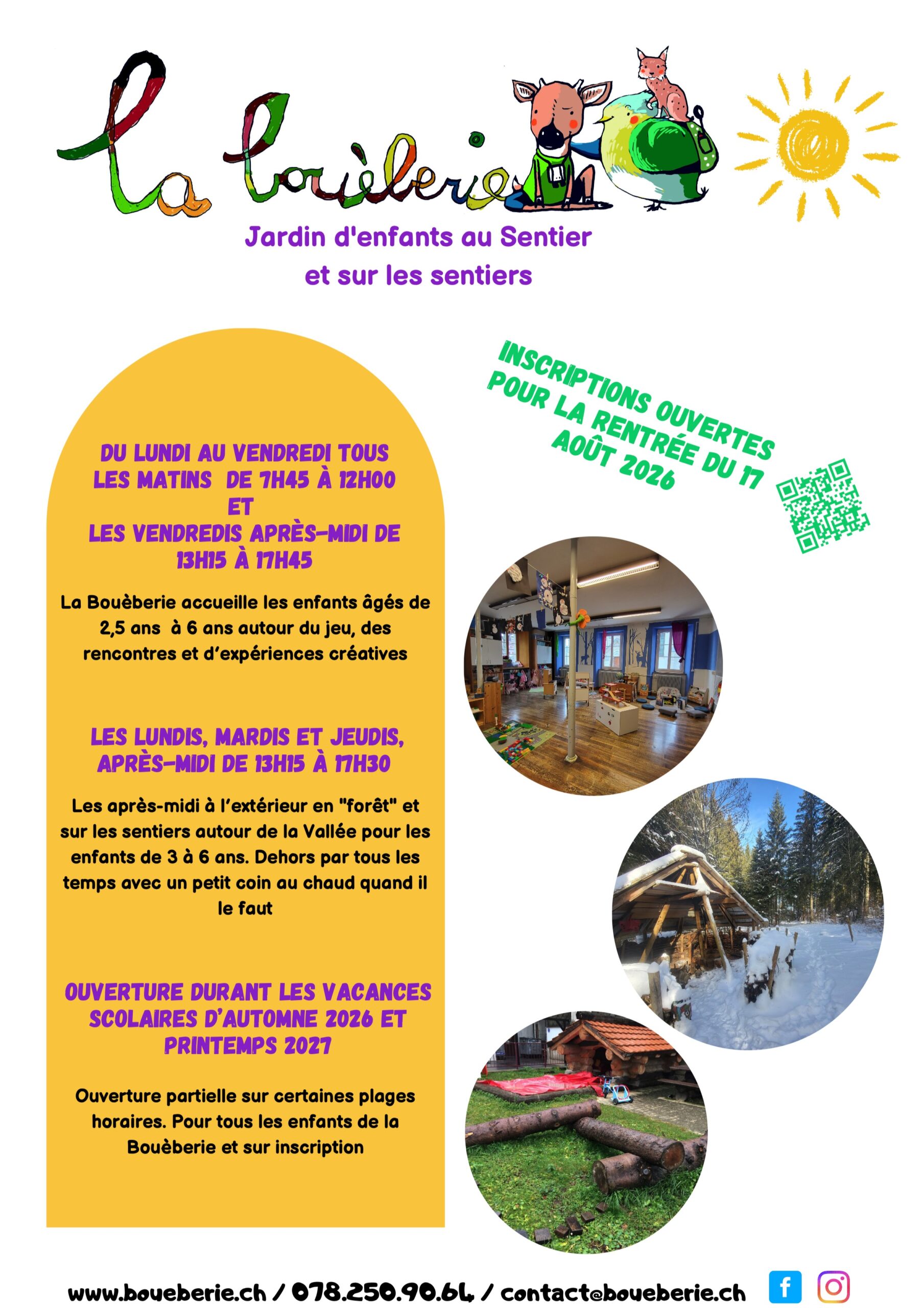 Depuis janvier 2000, La Bouèberie fonctionne comme jardin d’enfants, une éducatrice de la petite enfance diplômée assure la prise en charge des enfants et anime les demi-journées. Elle est soutenue dans son travail par le comité de l’association qui en assure également la gestion générale.